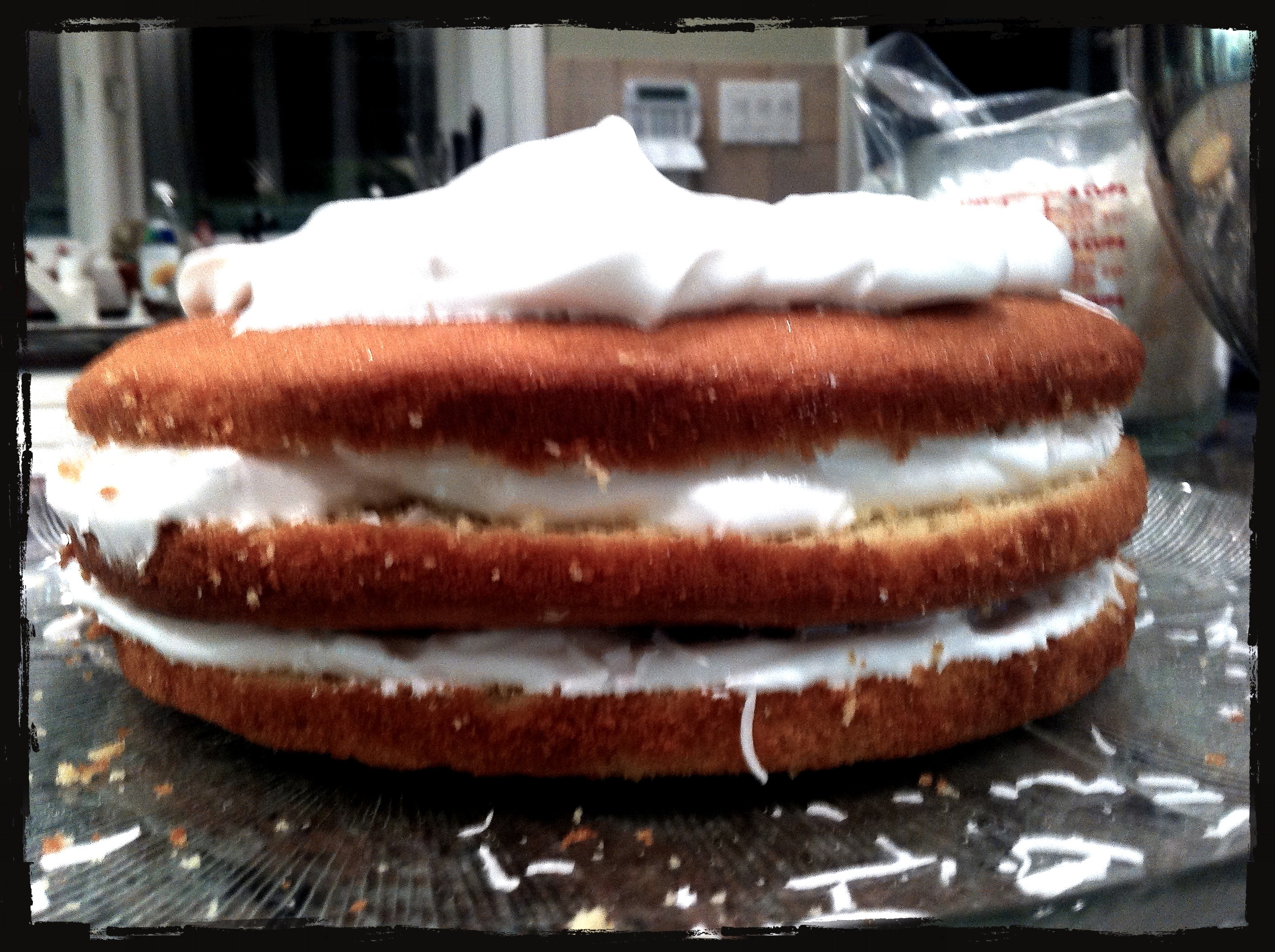 Place one cake layer onto a platter or cake decorating turntable. Drizzle 3 tablespoons of coconut milk over the cake layer and spread it around. Spoon about 1 1/4 cups of the frosting onto this layer and spread it thick, letting it spill a bit over the edges all around. Top with 1/2 cup of grated coconut. Continue layering cake layer, coconut milk drizzle, frosting, and coconut.