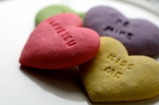 1. Cream butter in a stand up mixer. Sift icing sugar into creamed butter. Add remaining wet ingredients; eggs, sour cream & vanilla and mix until blended. 2. Divide wet ingredients into 4 small bowls by portioning 3/4 cup of wet mixture into each bowl. This should evenly distribute wet mixture into each bowl. Add desired food colouring to each portion and mix until blended. 3. In a separate medium bowl combine salt, baking soda, baking powder and flour. Whisk dries together to combine and to fluff up. 4. Scoop exactly 1 1/4 cup of dry mixture into each portion of coloured wet ingredients. If there isn’t quite enough dries to go around, add a little more flour to the last bowl you get to to gain the right consistency. Slowly mix together wets with dries in each individual bowl until mixture forms dough, then shape dough into four little balls. Don’t over mix. 5. Spread a sheet of saran wrap on counter and dust with flour. Drop dough onto saran, working with each dough ball individually. 6. With rolling pin, roll dough to 1/4 inch and seal a flat of dough with saran wrap. Chill each package of coloured dough on baking sheet for one hour or more. You can stack the dough flats. 6. After an hour of chilling in the fridge, preheat oven to 350 degrees F. Unwrap each dough package individually and work with dough flats one at a time. Roll and smooth dough to about 1/8-1/4 inch. Cut dough with cookie cutters and stamp letters on hearts while dough is still cool. Be careful not to mix colours. 8. Bake for 6-8 minutes or until bottom of cookies are golden. Keys to the cookies: Don’t over mix or over handle the dough. Roll the dough at least 1/4 inch thick and don’t overbake.The cookies turned out perfectly. They were subtly sweet, soft yet chewy, and had a hint of sour creaminess. They were delightful!