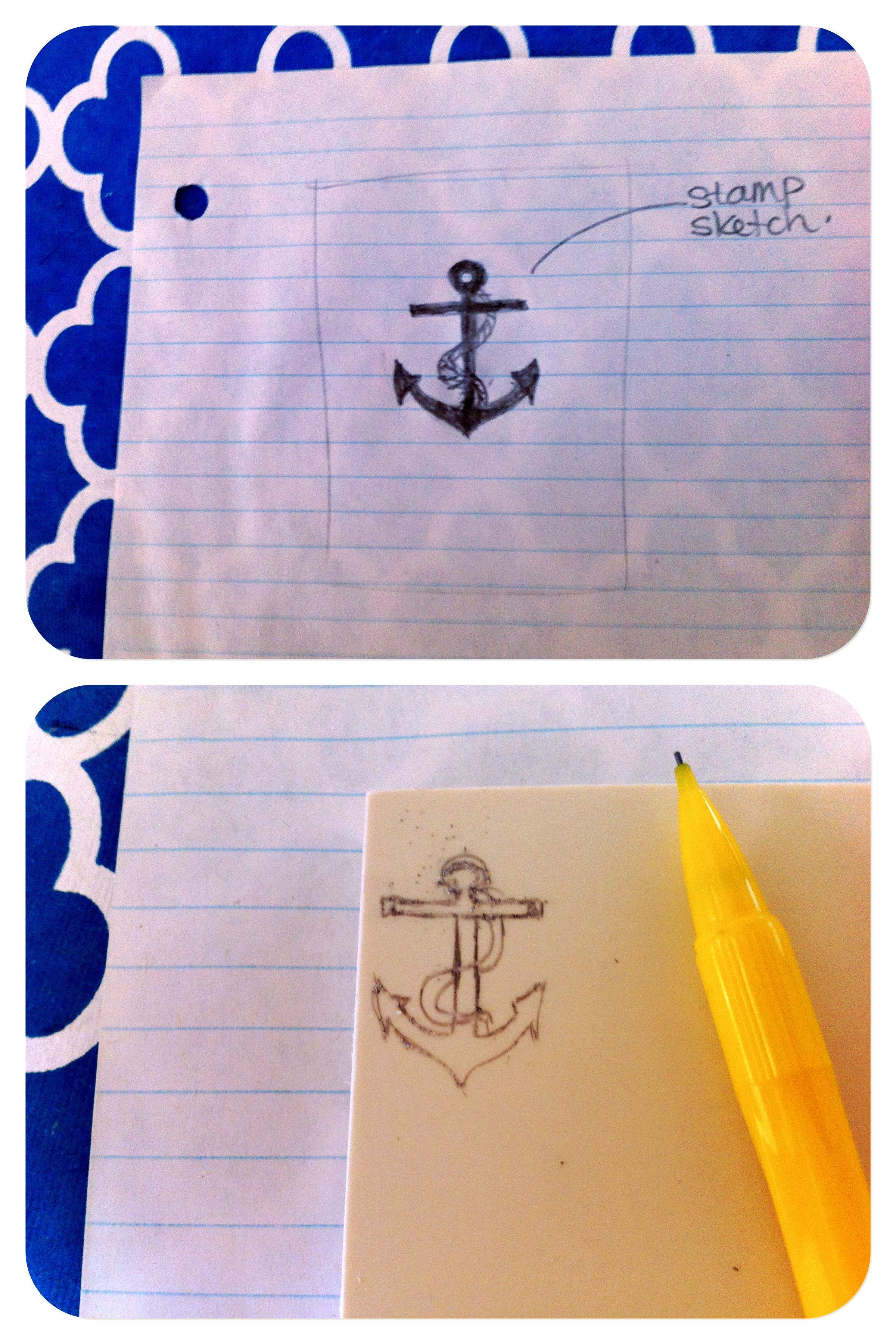 1. Design your stamp! Sketch whatever you like on a piece of paper first. I chose a nautical theme for my stamp since I was making it for a friend who has an affinity for anchors.
