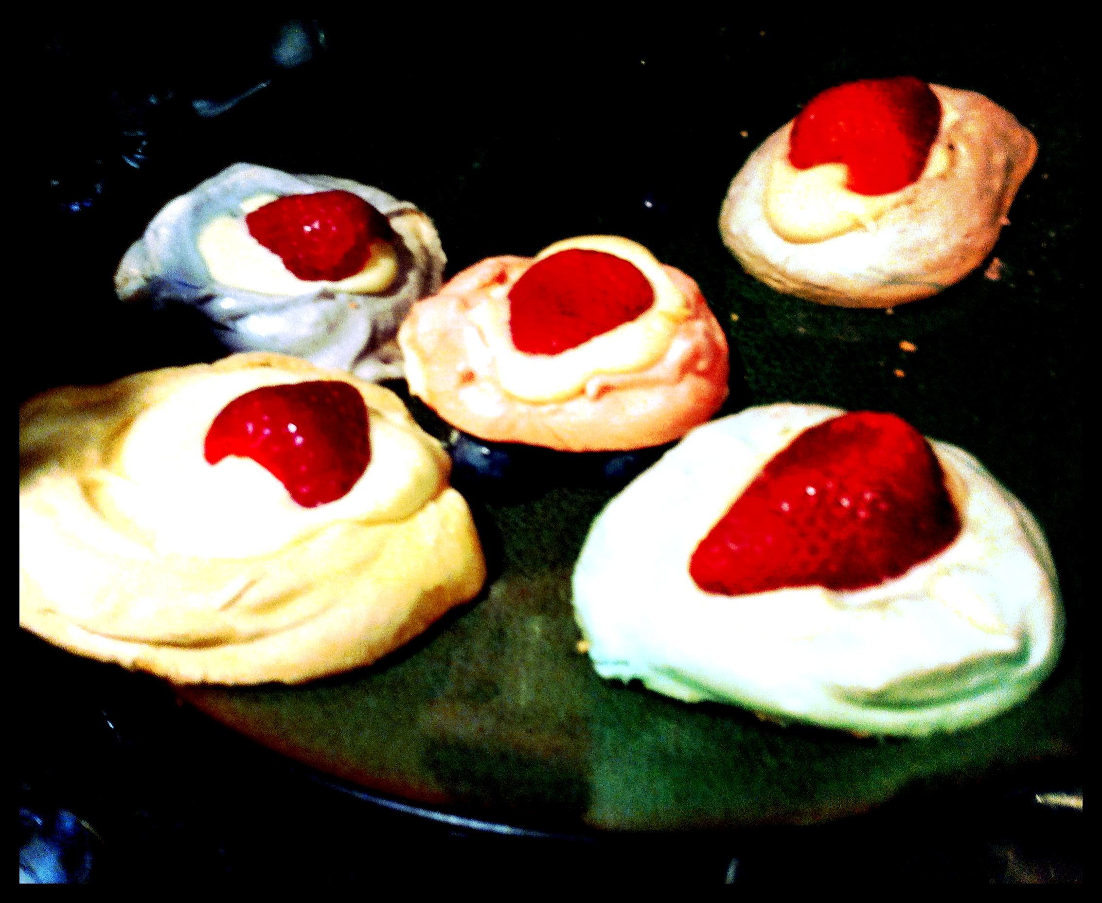 We decided to attempt pavlova after all, with a little tweaking of the recipe: We took an ordinary pavlova recipe, died the meringue fun colours and dolopped it into little individual sized nests, perfect for serving a big group. The final products looked so cheerful, especially with spoonfuls of vanilla custard and ruby red strawberries nestled inside. To me, the dessert seemed extremely reminiscent of Easter, but definitely made for a perfect pavlova fan’s going away party dessert.