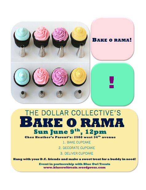 Members of the Dollar Collective were invited over to bake cupcakes and then distribute them to friends at work, school or strangers on the street. Since icing cupcakes can always be a challenge, we turned it into a cupcake workshop and then sweet treat delivery day. The steps were: 1. bake cupcake. 2. decorate cupcake. 3. deliver cupcake. It was fun! Here’s the poster I designed: