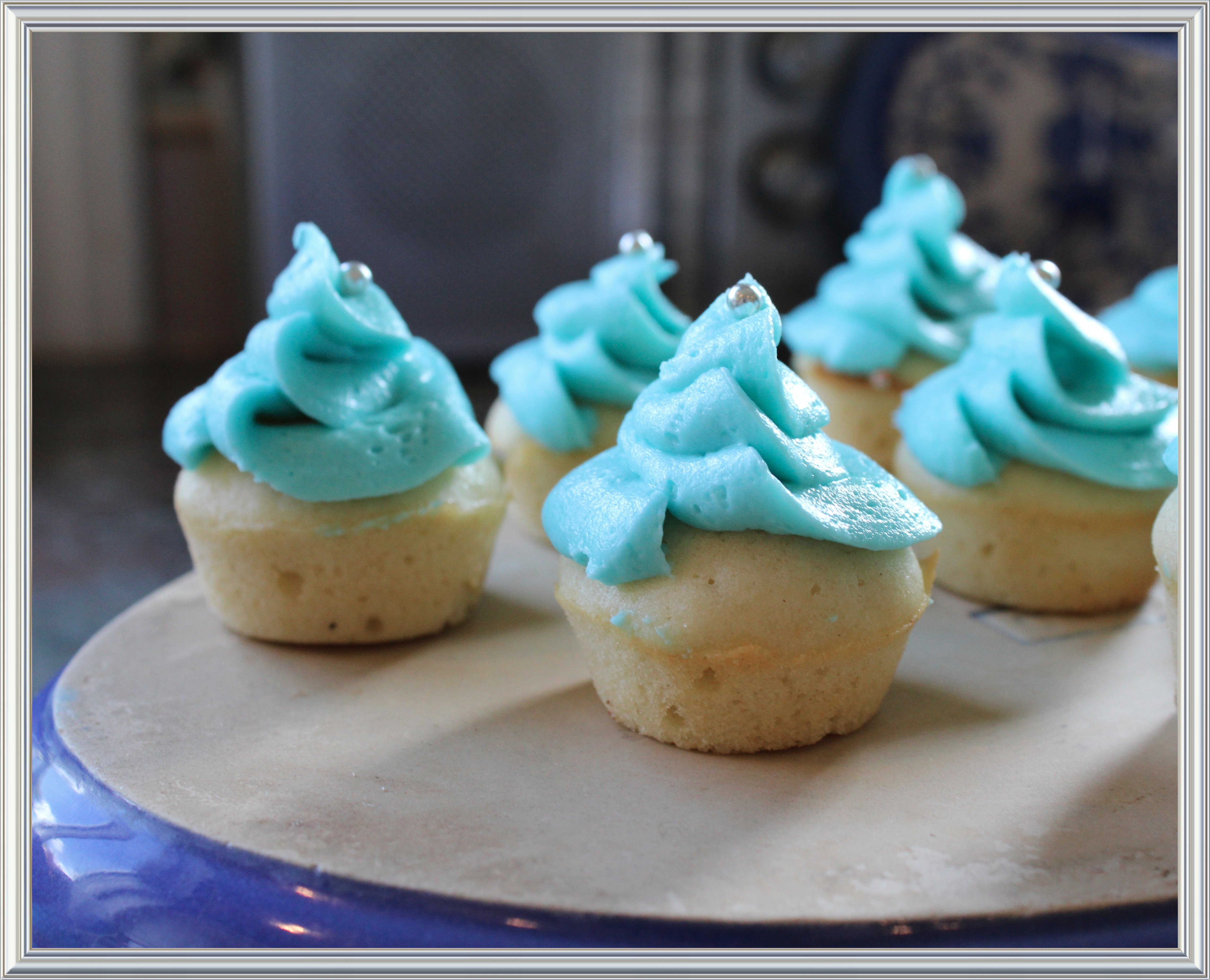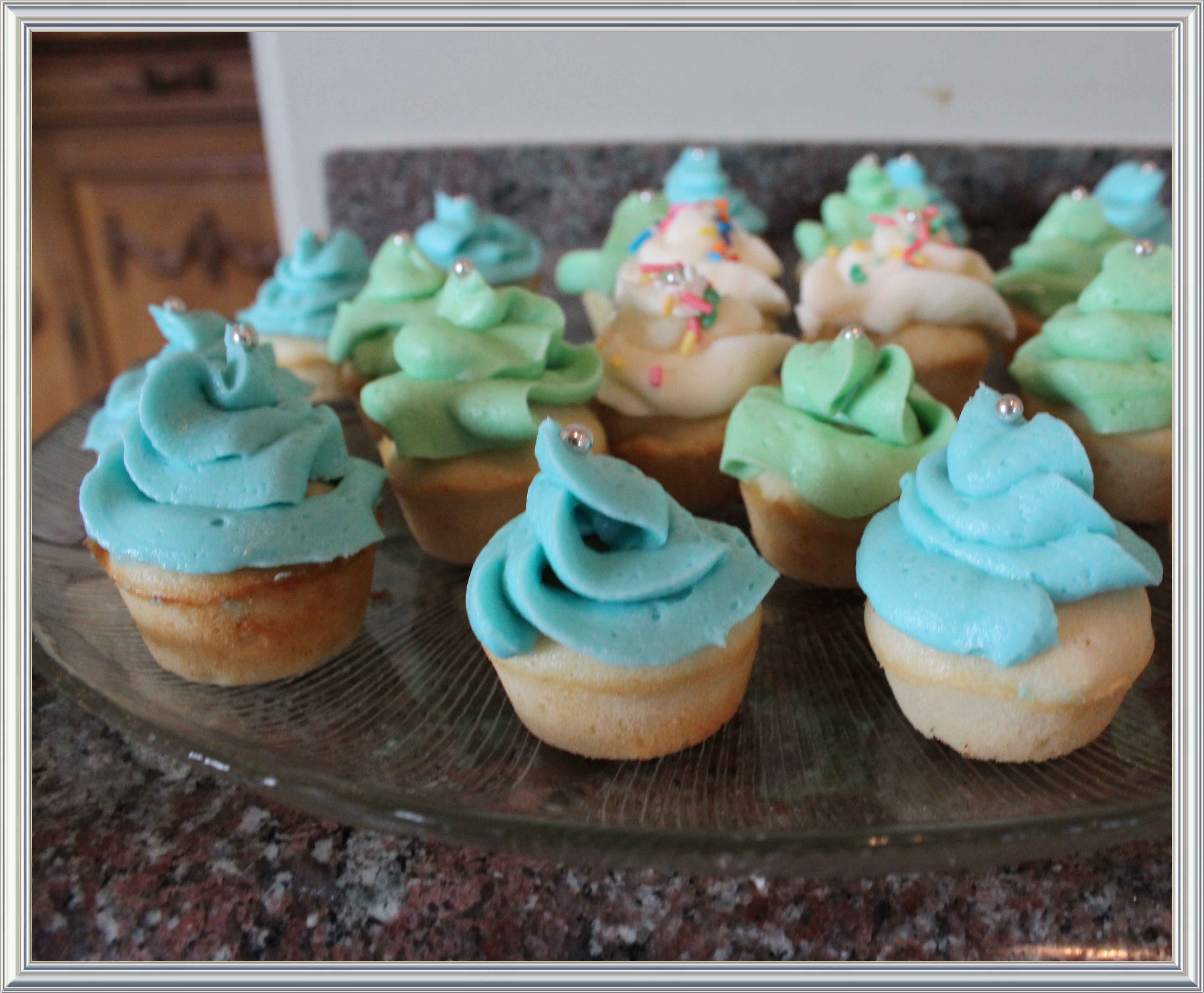 We decided to bake vanilla cupcakes with mint, blue and funfetti buttercream frosting.