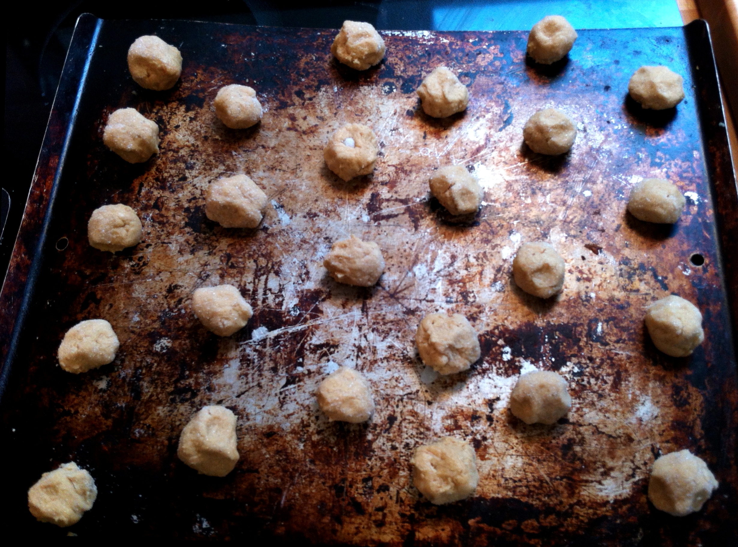 - Roll balls of dough in white sugar before placing on an ungreased baking sheet. Press down lightly with the prongs of a fork to create a criss cross pattern.Bake at 350 degrees F for 10 to 12 minutes. Do not over bake.