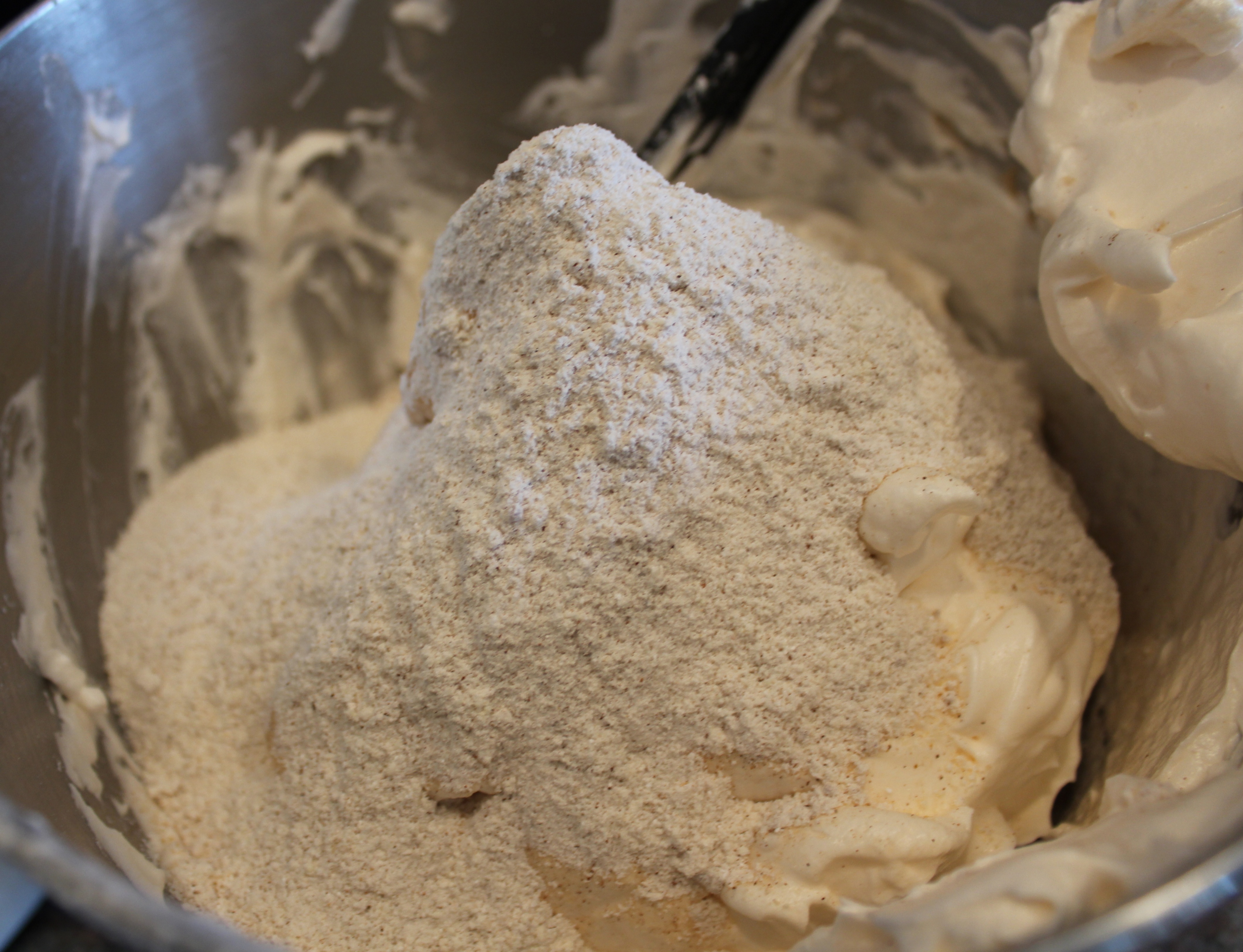 5. Remove paddle attachment from mixer, and hand fold dry ingredients into the egg whites. Be gentle, and mix for about 30-40 turns, until the mixture is lava like in texture – this enough to mound up on itself, but fluid enough to melt back down.