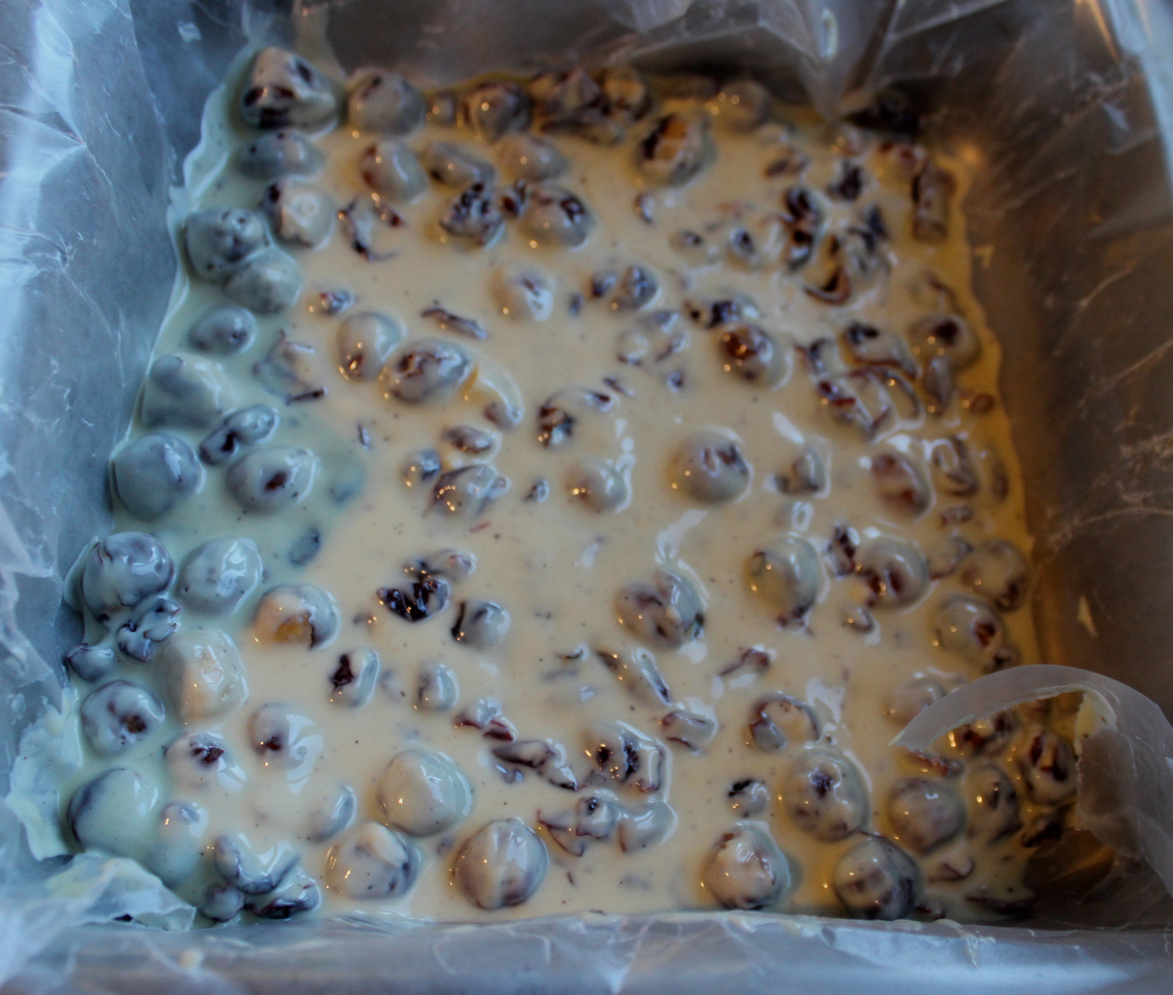 3. In microwave, melt white chocolate in a medium bowl for 30 second bursts. Stir chocolate between zaps with a metal spoon until nicely melted. Add cranberries and toasted hazelnuts to melted chocolate. Stir until coated, then pour mixture onto prepared baking sheet. Spread evenly until it measures about 1/4 inch thick. Refrigerate until chocolate is cold and hard.