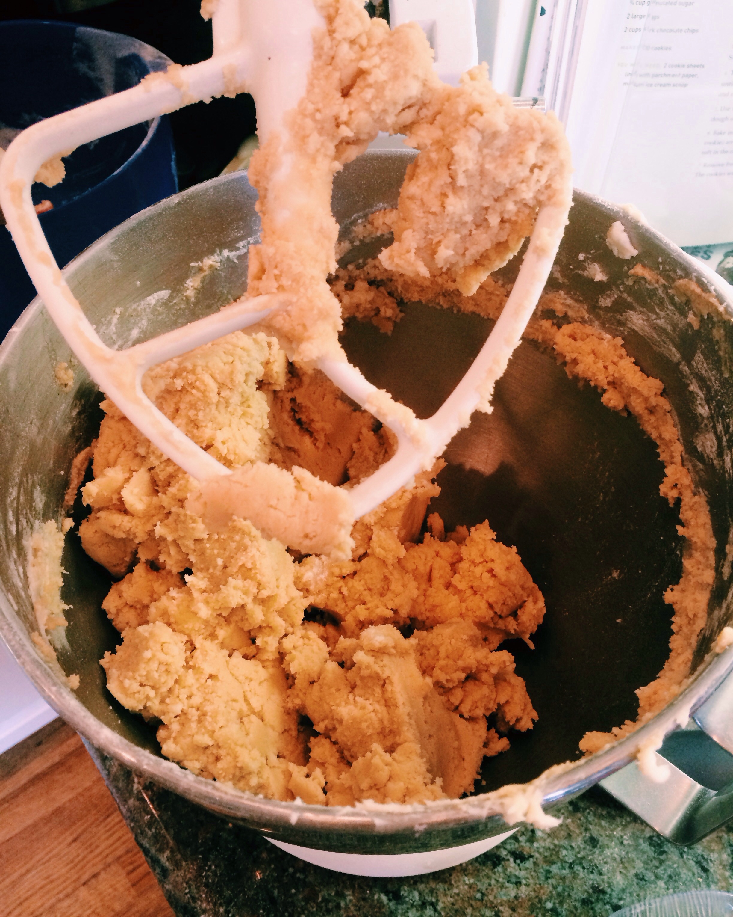 5. Turn mixer to low and add dry ingredients. Mix until fully combined. Add chocolate and nuts. Mix until all mixed in!