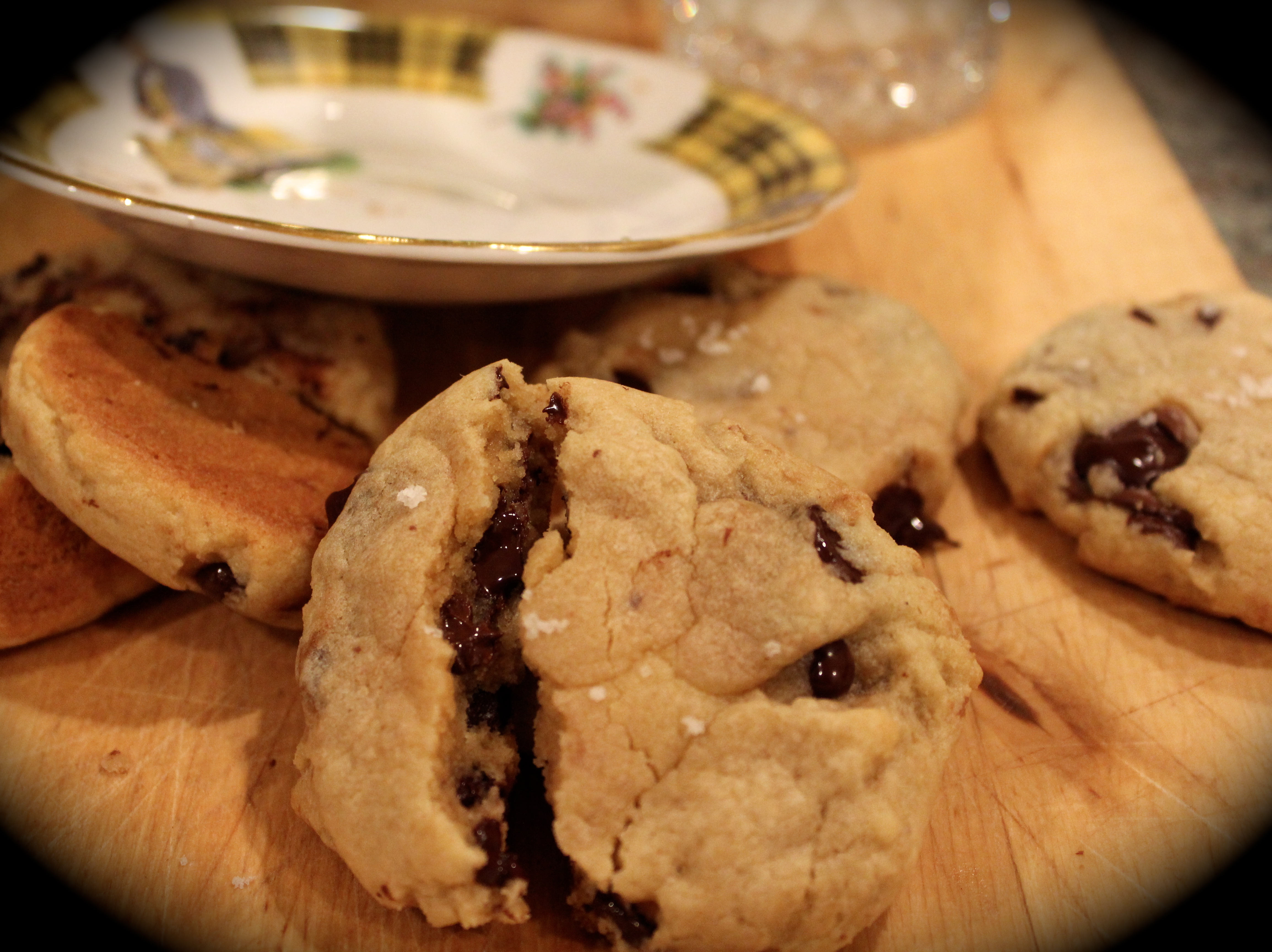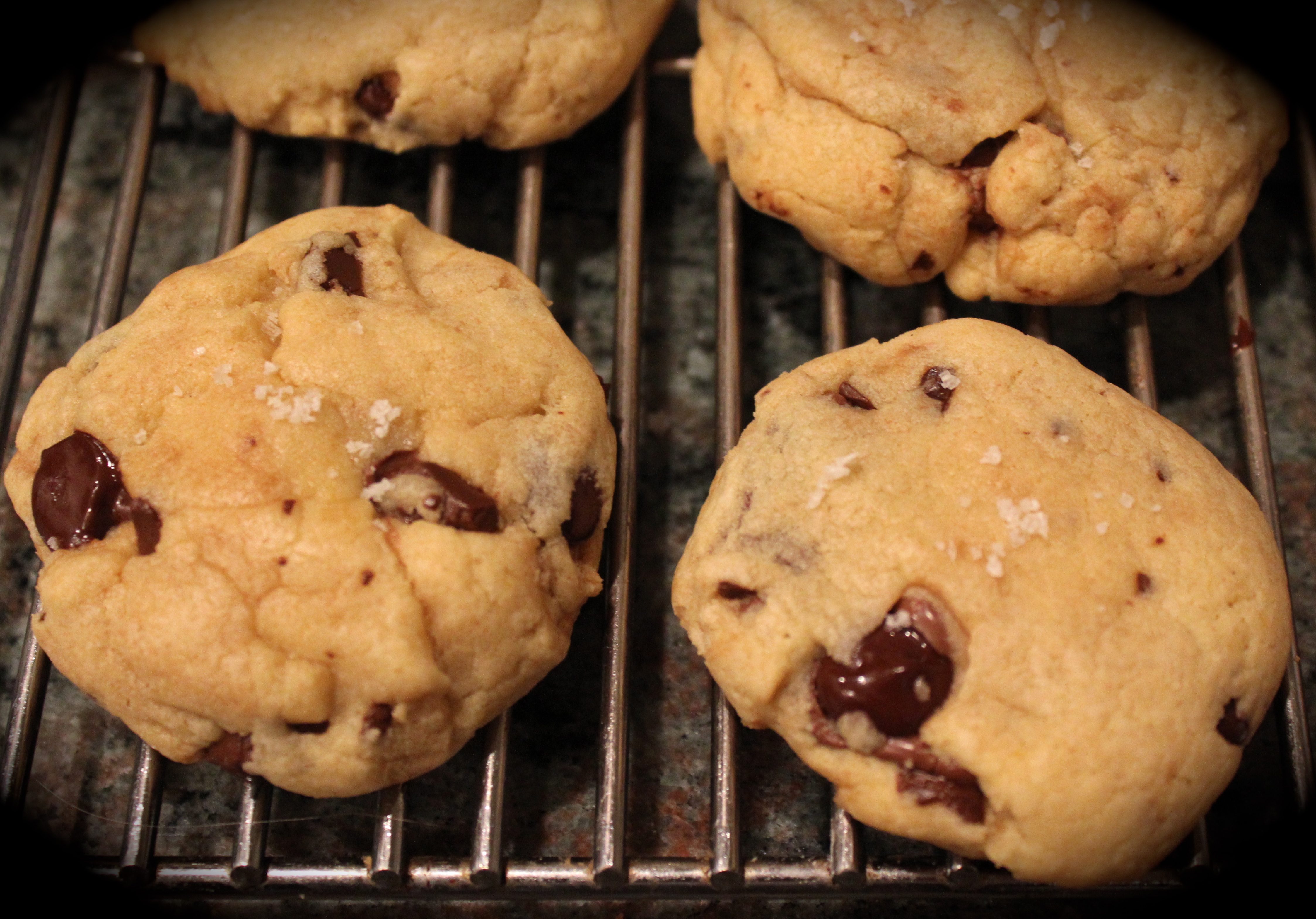 5. Bake the cookies 9-11 minutes or until the edges of the cookies begin to turn golden brown. They will look a bit underdone in the middle, but will continue to cook once out of the oven. Cool the cookies on the sheets at least 2 minutes. Sprinkle with a little sea salt. Remove the cooled cookies from the baking sheets after a few minutes and transfer to a wire rack to cool completely. Repeat with remaining dough.