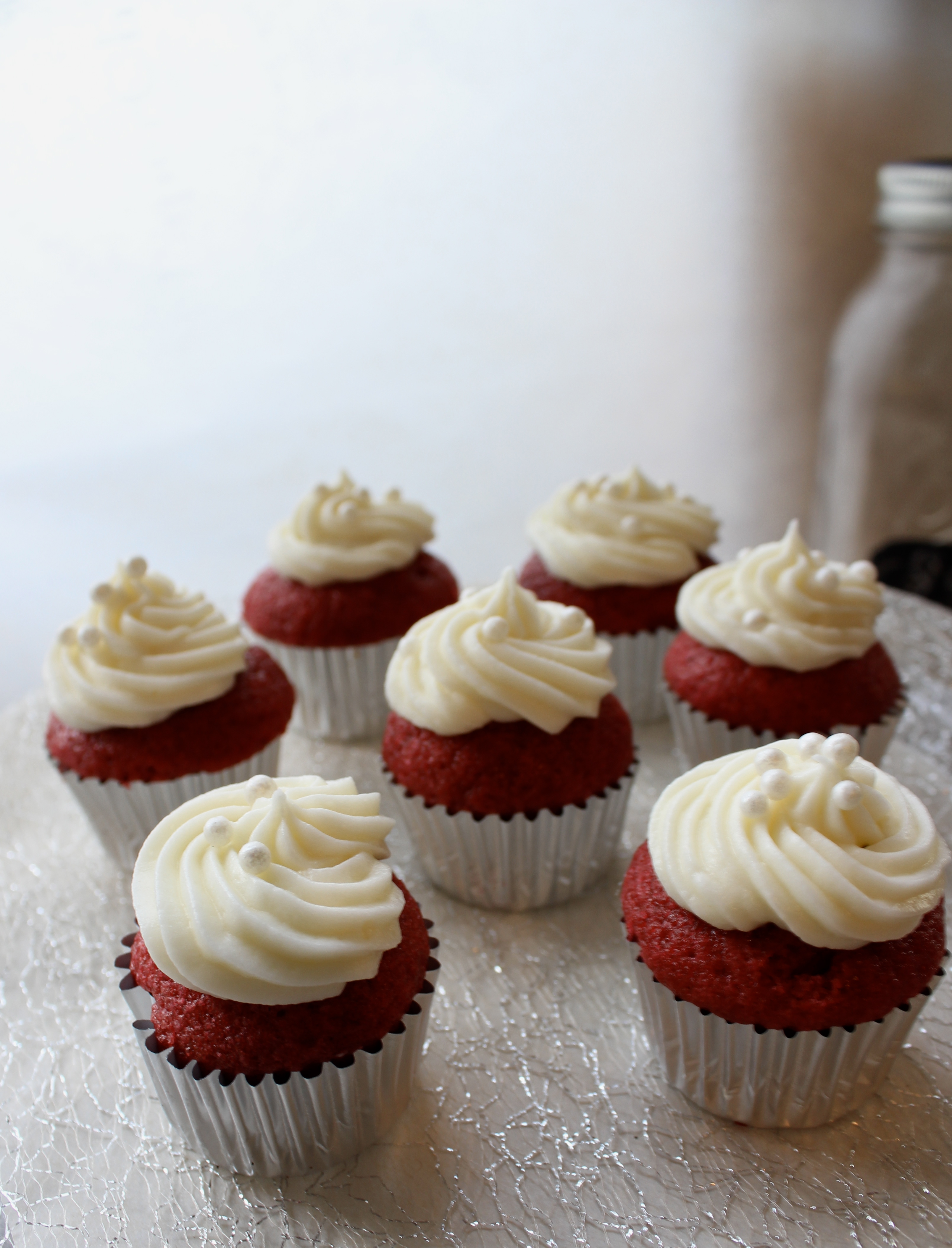 The recipe is most commonly made today as a cupcake! Instead of beet juice, I took the less natural route (sorry) and used Wilton’s “Christmas Red” gel dye to give these cupcakes their deep scarlet red! Blended with dutch-processed cocoa powder and buttermilk, this cupcake batter is creamy, rich and decadent without being overly sweet. The pristine white frosting iced into swirled peaks pairs so beautifully with the tiny fluffy red cakes, and has a scrumptiously tart and cheesy taste to balance the cake’s rich flavour.