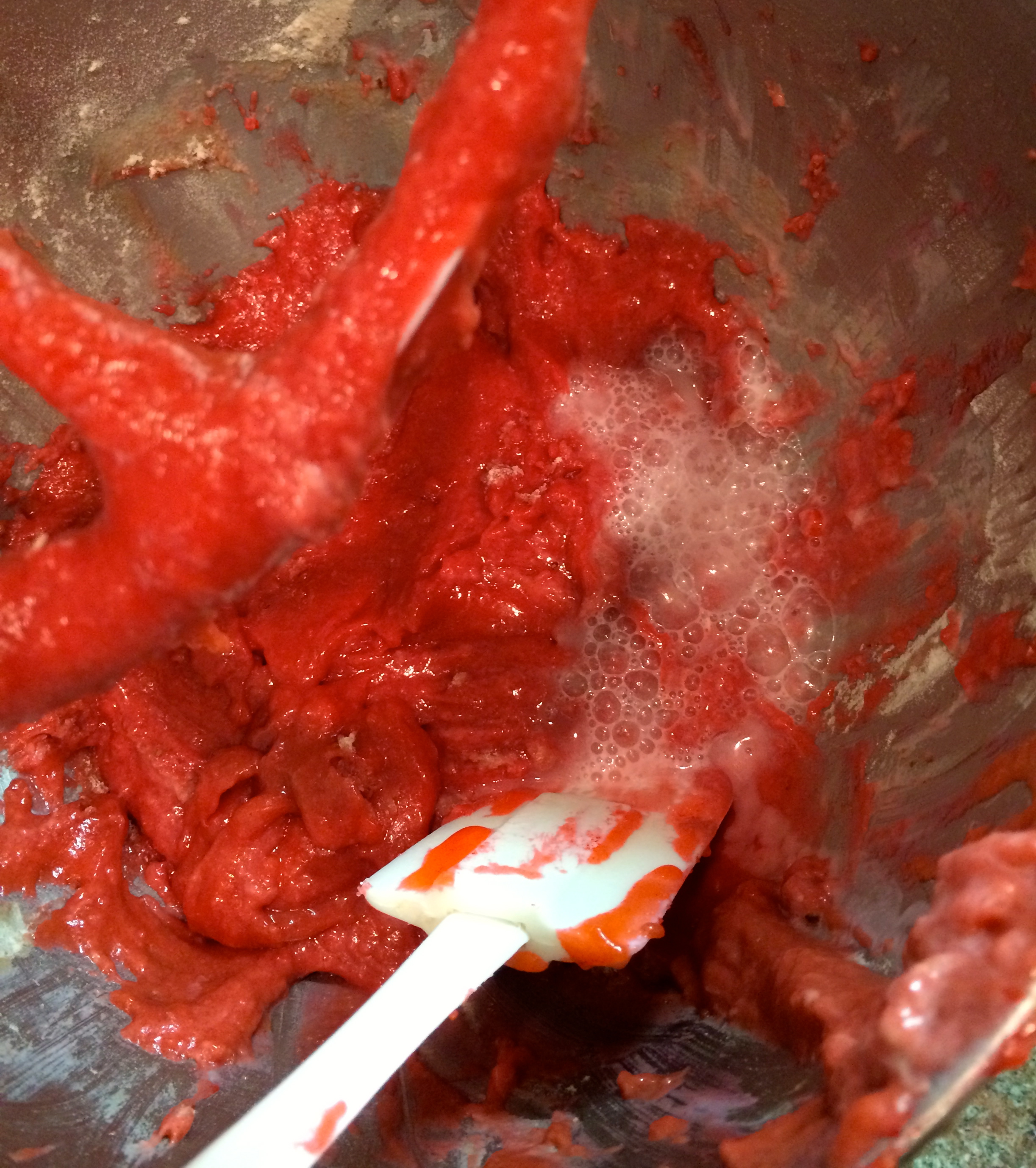 4. Reduce speed to low. Add flour mixture in three batches, alternating with two additions of buttermilk, whisking well after each. Stir together th ebaking soda and vinegar in a small bowl (it will foam). Add mixture to the batter, and mix on medium speed 10 seconds.