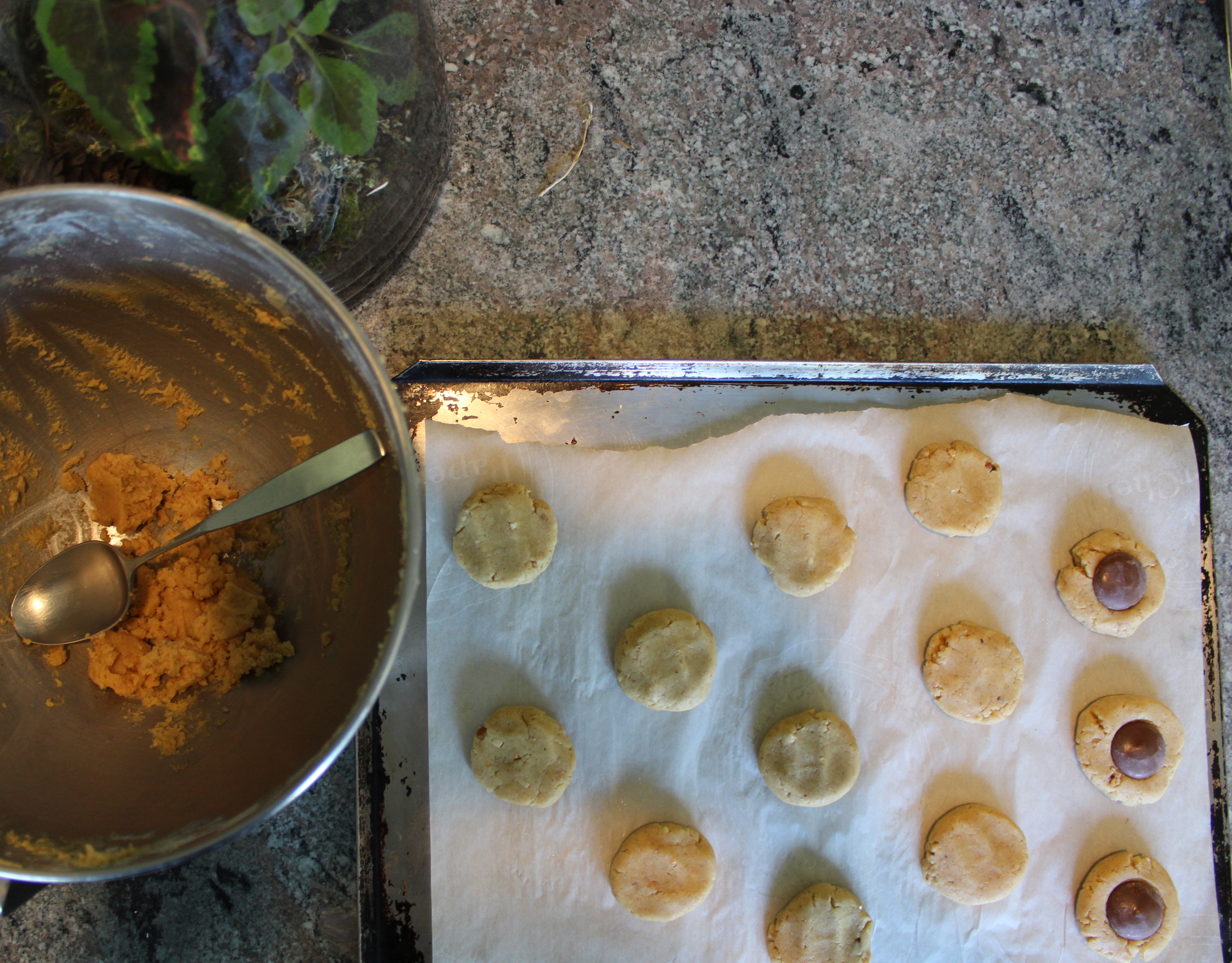 5. Spoon cookie dough and roll into 1 inch balls and place 1 inch apart on baking sheet. Gently squish balls down. If using chocolate medallions, place them in the centre of each squished cookie ball.