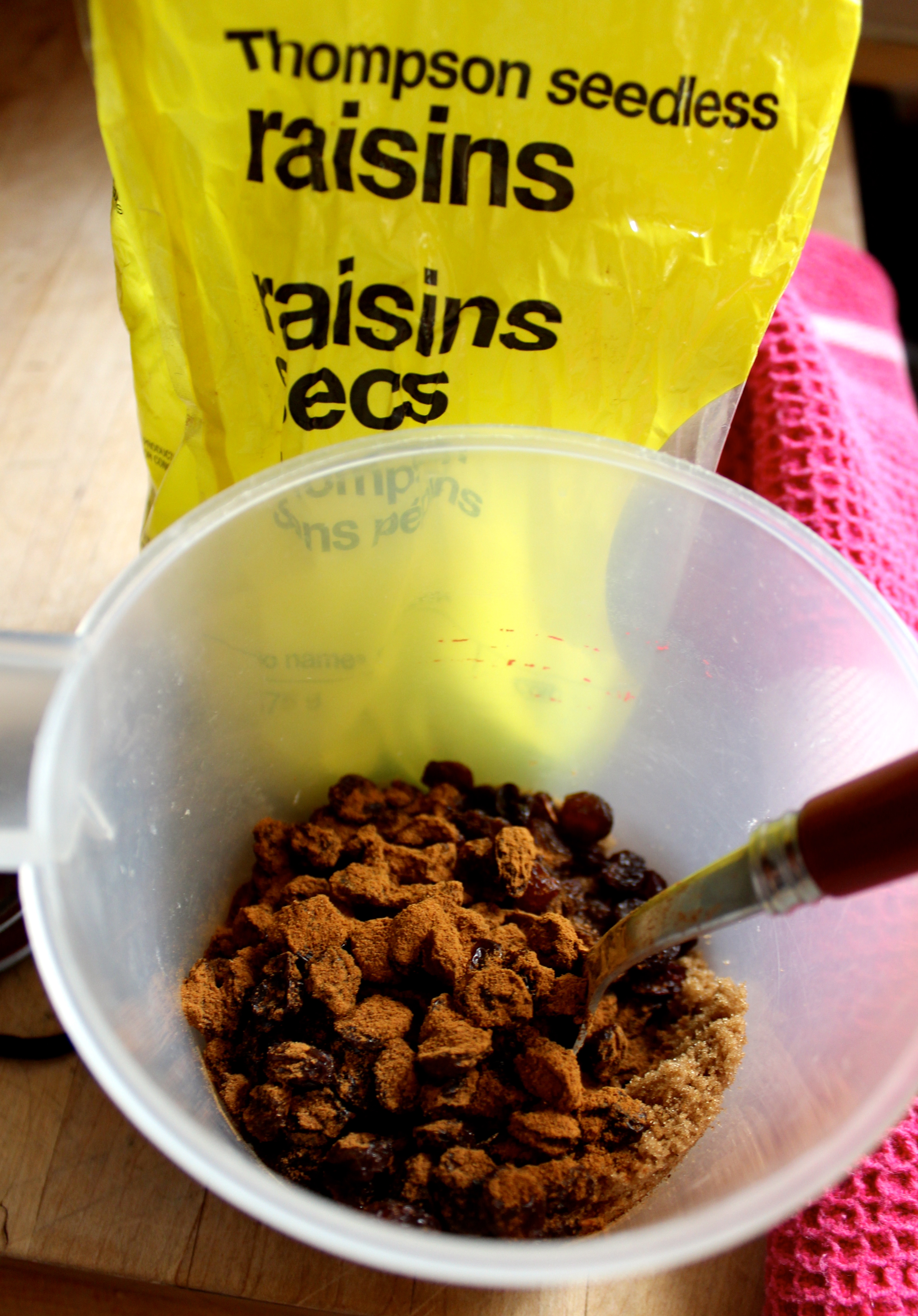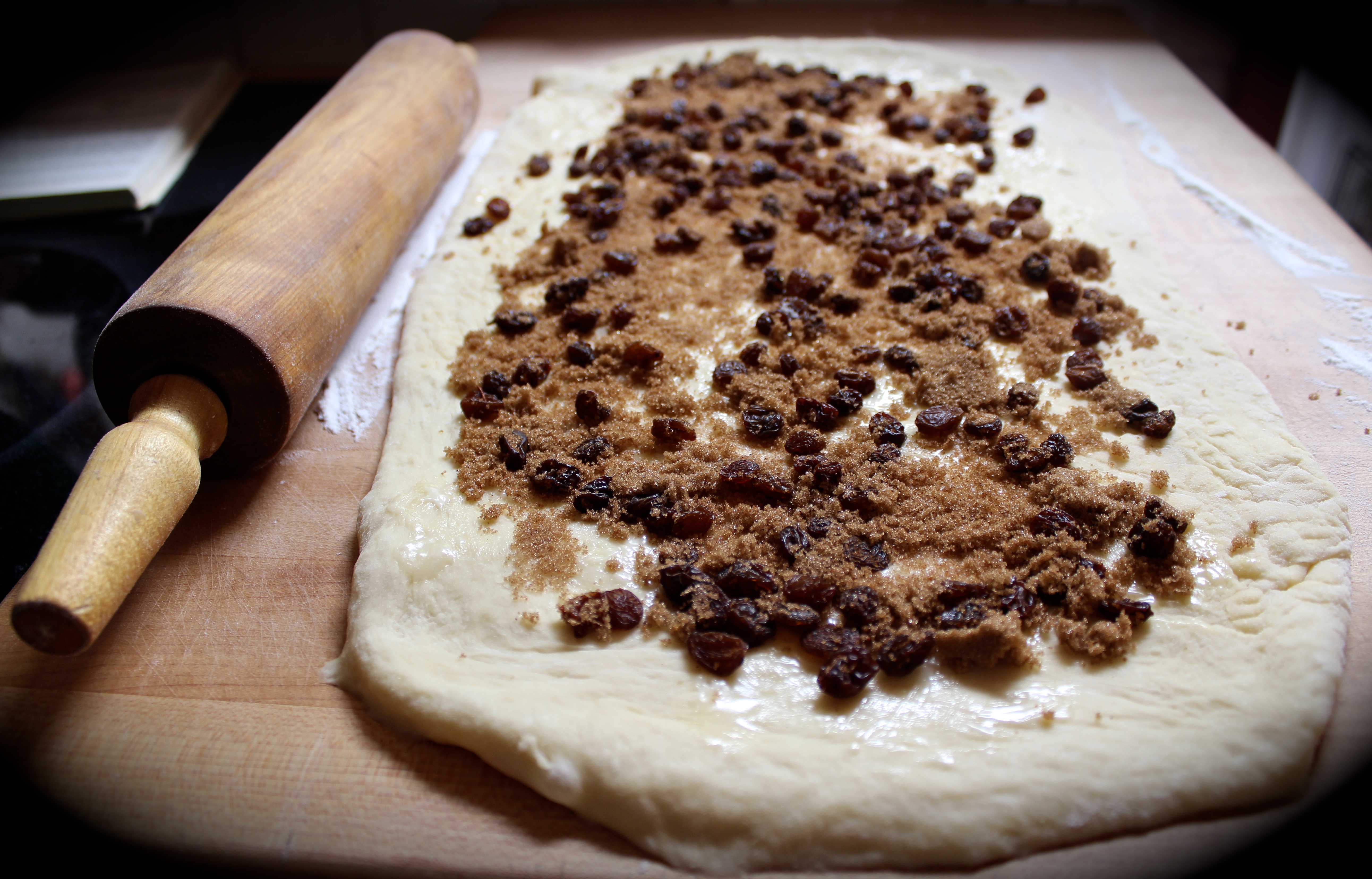 3. Mix filling ingredients (raisins, cinnamon, brown sugar and walnuts) together in a small bowl and stir until combined. Set aside. Once dough has risen to double its size, divide in half and roll each half out to a rectangular sheet about 1/2 inch thick. and three times as long as wide.