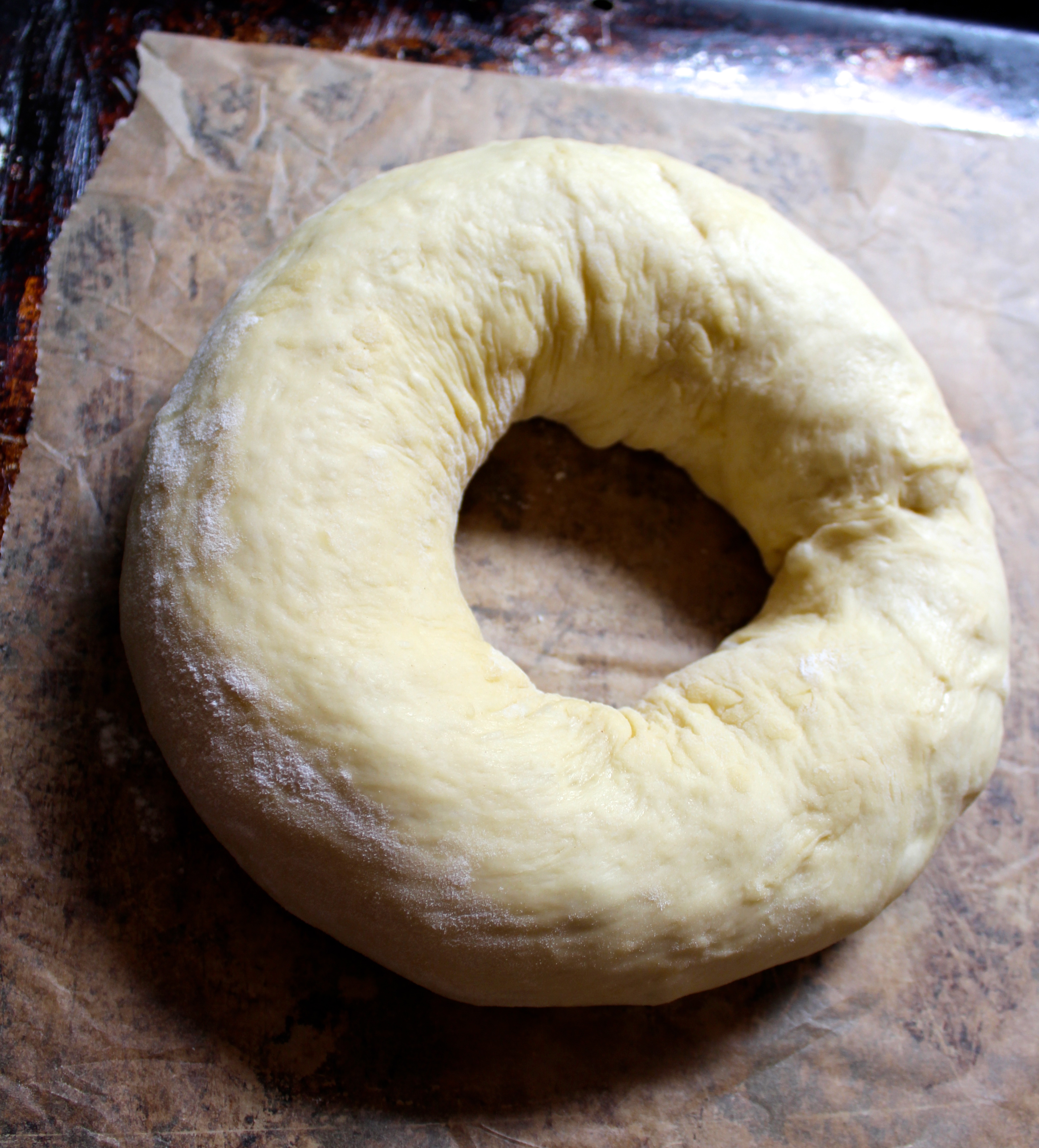 My recipe makes enough dough for two tea rings. If you’re feeling extra creative, perhaps make two kinds of loaves? I made one sweet and the other savoury. In one of my loaves I tucked away walnuts, cinnamon and raisins into the doughey roll to make the sweet cinnamon-bun-y sort of loaf you see here!