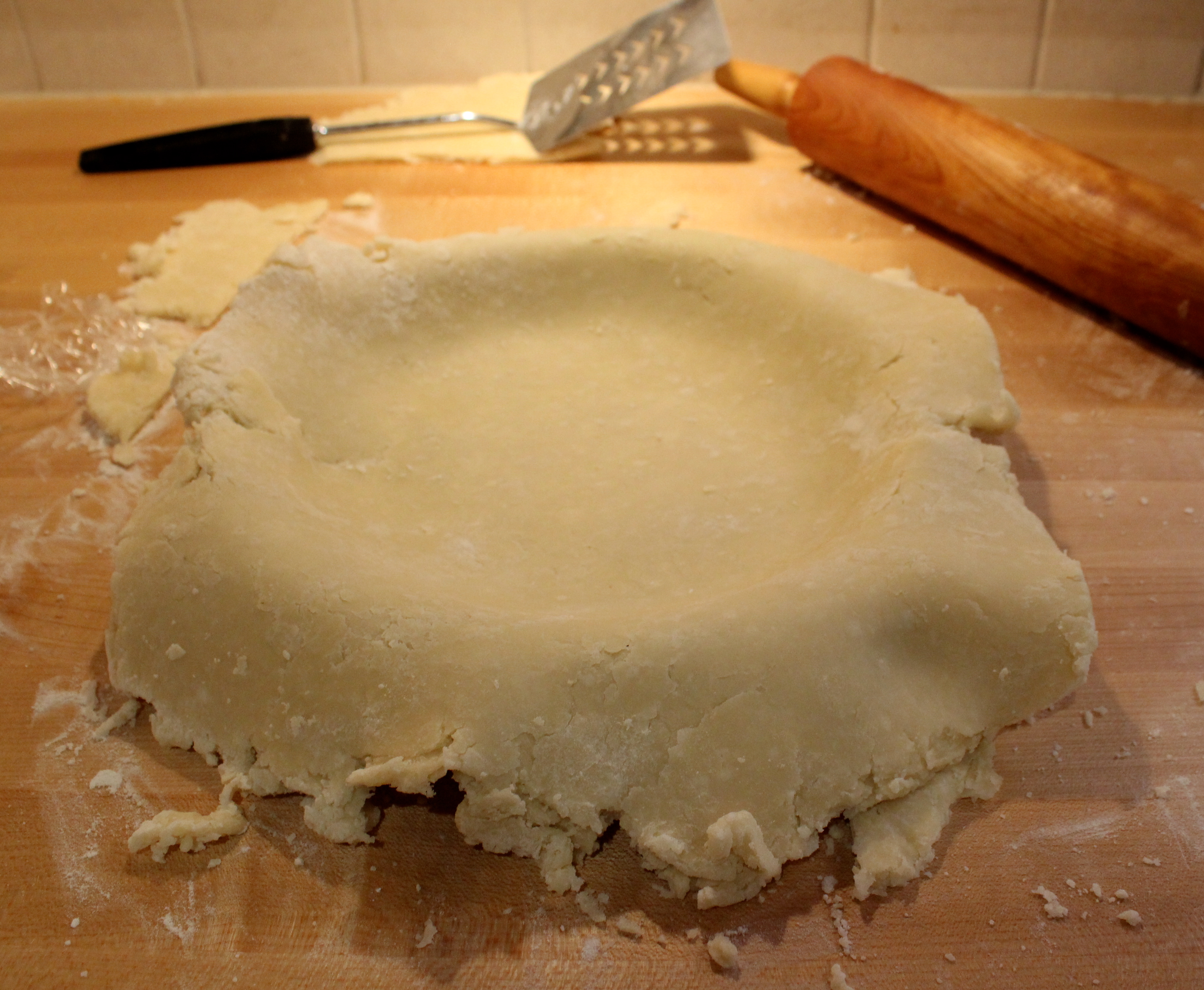 5. Remove one of your pastry disks from fridge 20 minutes before use. Sprinkle flour on surface and rub flour over rolling pin. Working from centre of your first pastry disk, roll dough away from you, then turn dough about 30 degrees and roll again. Repeat this process until you have a flat, round disc, about 3 mm thick. Sprinkle extra flour over the work surface as needed, but don’t over-flour. Try to push down with your weight on the dough, instead of stretching it with excessive pushing. Stretching will cause the pastry to shrink when baking. (oops!) Transfer pastry to a tray and place in fridge, covered in plastic for at least 2 hours.