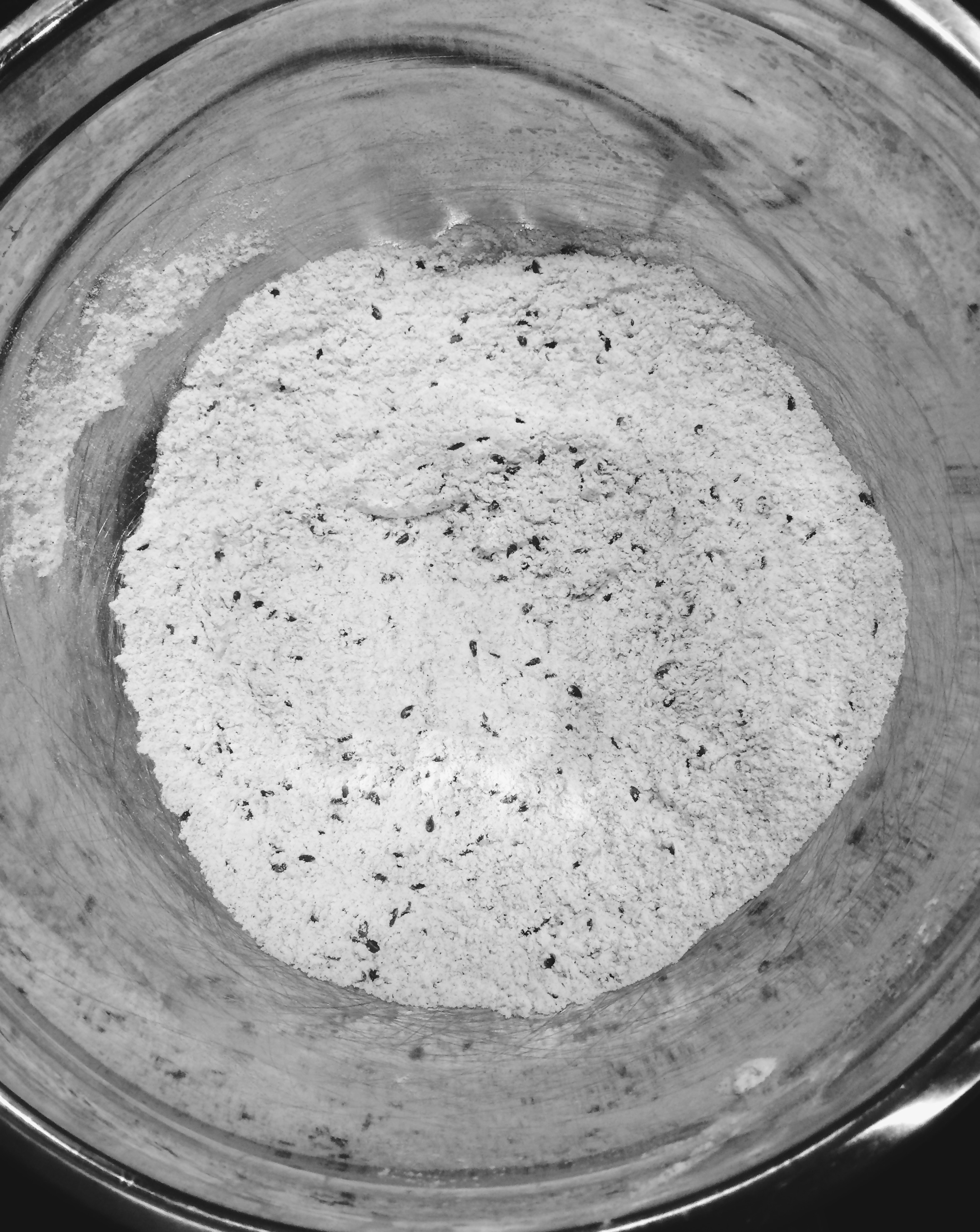 1. Combine both flours with the flaxseeds, baking powder, spices and salt in a lare mixing bowl. Incorporate them with a wire whisk. In a separate mixing bowl, combine the egg, egg white, milk, butter and molassess and whisk until frothy, about 2 minutes.